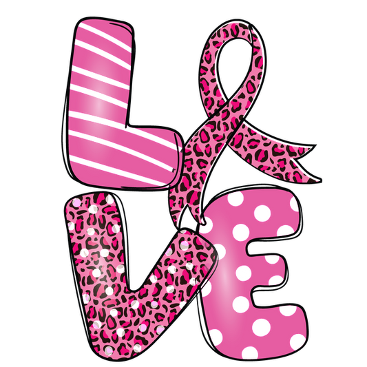 Un diseño vibrante "LOVE" con divertidos patrones rosas y una cinta con estampado de leopardo, perfecto para difundir positividad y estilo.