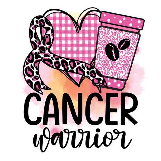 Un diseño colorido que presenta una cinta con estampado de leopardo, una taza de café rosa y la palabra "CÁNCER", que combina estilo con un mensaje de apoyo.