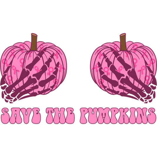Estas lindas calabazas rosas adornadas con diseños de esqueletos promueven el mensaje “Salven las calabazas” en letras divertidas y atrevidas.