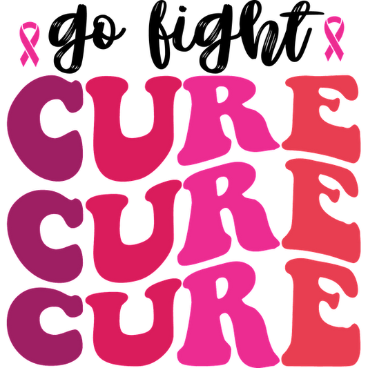 Diseño de texto colorido "CURE" con varios tonos de rosa, que enfatiza el apoyo y la concientización, junto con un símbolo de cinta rosa.