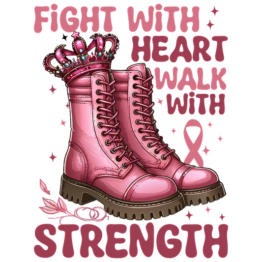 Botas de combate de color rosa atrevidas adornadas con una corona que promueve la fuerza y la resistencia, complementadas con un símbolo de cinta rosa.