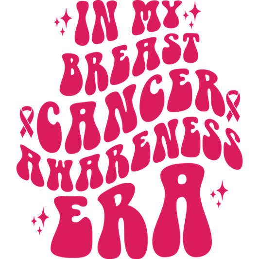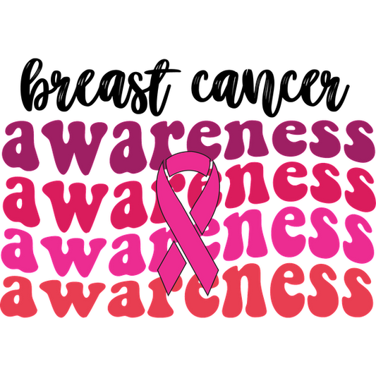 Este gráfico rosa vibrante promueve la concientización sobre el cáncer de mama con letras psicodélicas, enfatizando la importancia de la concientización y el apoyo.