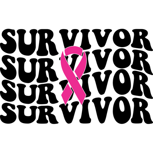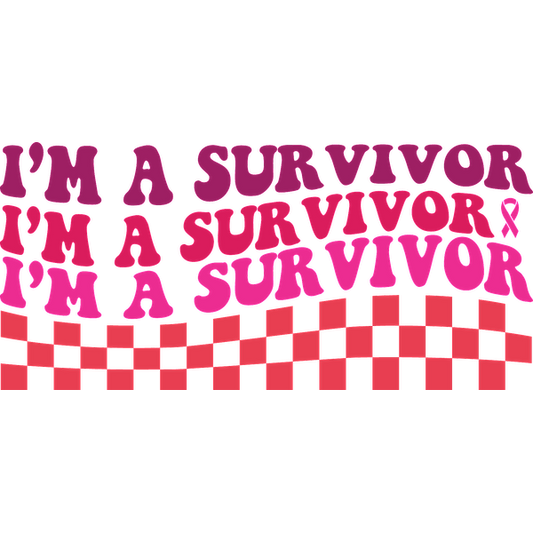 Diseño de texto atrevido y colorido que proclama "Soy un sobreviviente" con un lazo rosa, perfecto para el empoderamiento y la concientización.