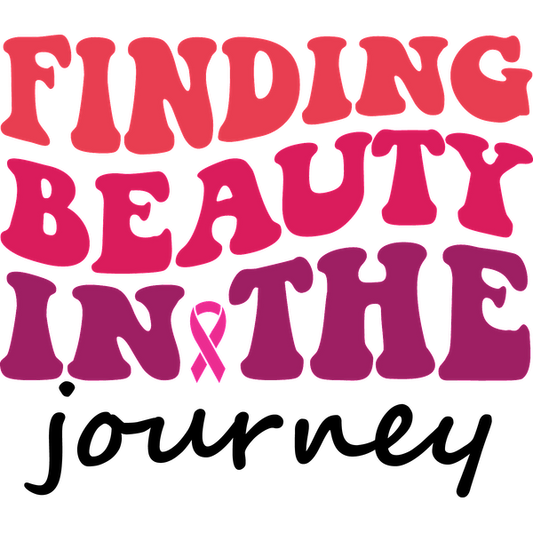 Un diseño de texto vibrante e inspirador que dice "Encontrar la belleza en el", presenta un símbolo de cinta rosa para generar conciencia.