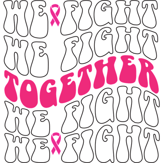 Un diseño atrevido y solidario que presenta la frase "LUCHAMOS JUNTOS" en letras divertidas, realzada con una cinta rosa.