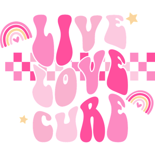 Un diseño vibrante y divertido que presenta las frases "Live Love Cure" en letras de burbujas rosas en negrita, acentuadas por arcoíris y estrellas.