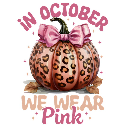 Una elegante calabaza con estampado de leopardo adornada con un lazo rosa, que promueve el divertido mensaje "En octubre, vestimos de rosa".