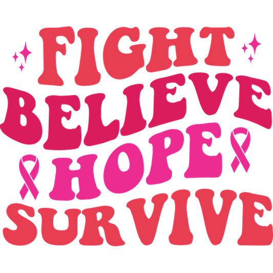 Un diseño vibrante que presenta las palabras empoderadoras "Lucha, cree, espera, sobrevive" con cintas rosas, promoviendo el apoyo y la resiliencia.