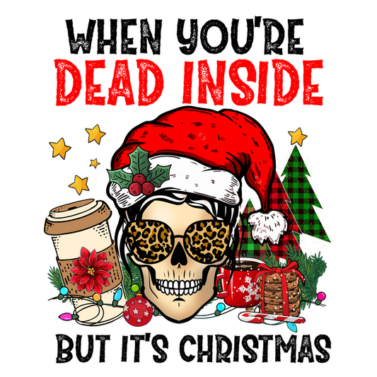 Un peculiar diseño festivo que presenta una calavera con un gorro de Papá Noel, gafas de sol, café y elementos festivos y que dice "Muerto por dentro".