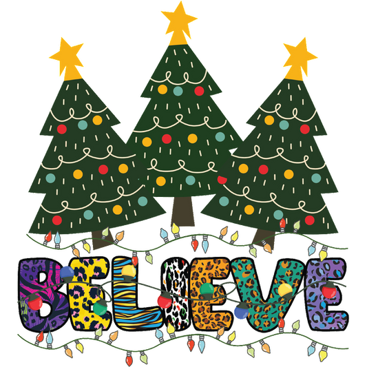 Celebre el espíritu navideño con árboles de Navidad vibrantes y letras coloridas "BELIEVE", adornados con luces y patrones festivos.