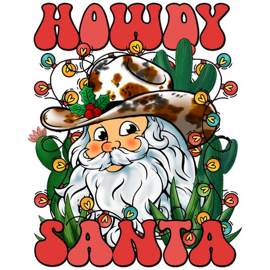 Alegre ilustración de Papá Noel con sombrero de vaquero, rodeado de cactus y luces festivas, con el texto "Hola Santa".