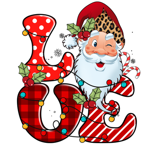 Un diseño navideño caprichoso que presenta a Papá Noel guiñando un ojo junto a la palabra festiva "AMOR", adornado con luces de colores y acebo.