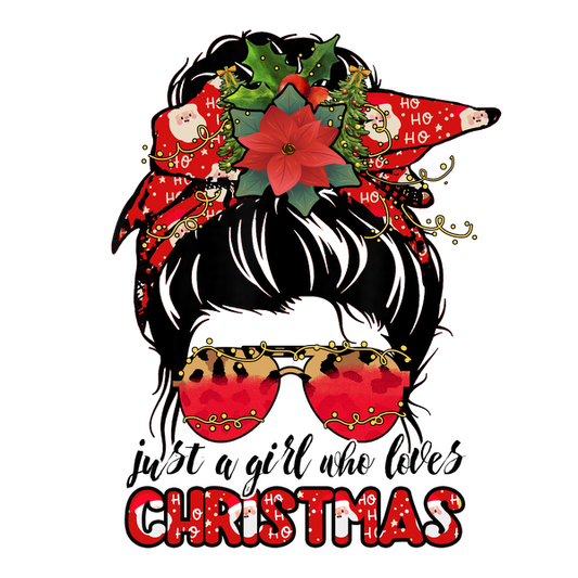 Una ilustración festiva que presenta a una niña con accesorios navideños, gafas de sol y el texto "solo una chica que ama la Navidad".