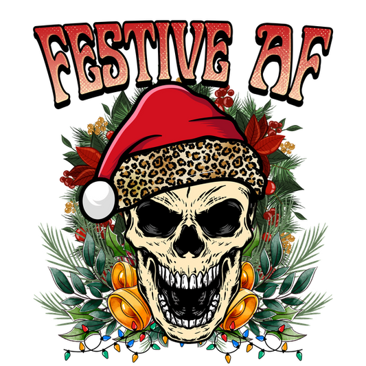 Precio habitual A partir de £0.75 GBPPrecio habitualPrecio unitario / por£2.40 GBPPrecio de oferta A partir de £0.75 GBPUn gráfico atrevido y divertido con temática navideña que presenta una calavera sonriente con un gorro de Papá Noel adornado con estampado de leopardo y rodeado de vegetación festiva.