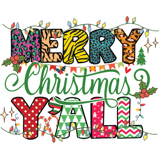 Diseño festivo "Feliz Navidad a todos" con letras coloridas y estampadas adornadas con luces navideñas y decoraciones para un ambiente alegre.