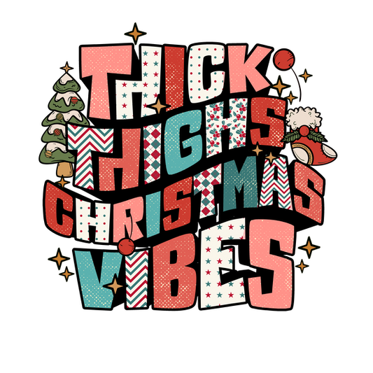 Un gráfico festivo y divertido que presenta la frase "Thick Thighs Christmas Vibes" con divertidos elementos navideños como árboles y Papá Noel.