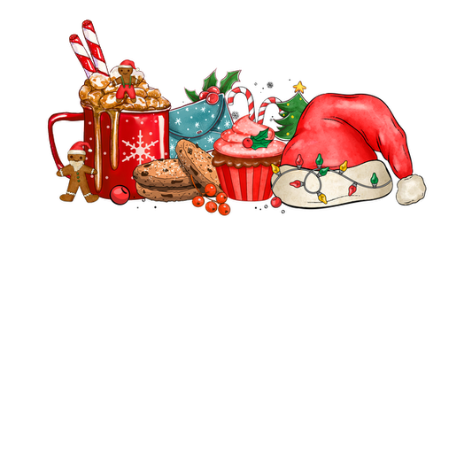 Un diseño festivo que presenta una taza de cacao, un hombre de jengibre, un árbol de Navidad y unas botas cómodas, para celebrar el amor de una niña por la Navidad.