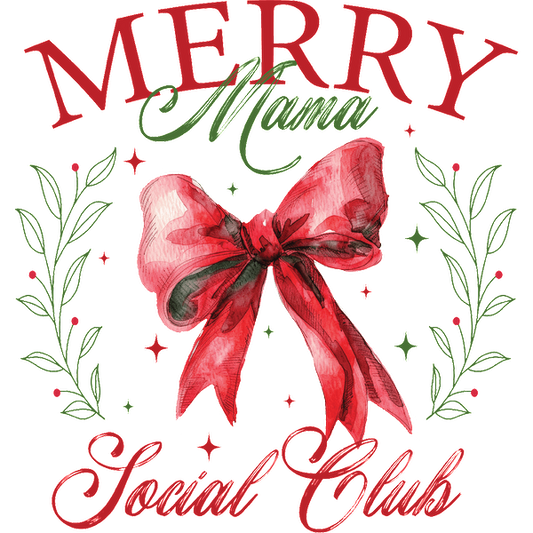 Una ilustración festiva que presenta "Merry Mama Social Club" en texto colorido, adornado con un lazo rojo y vegetación decorativa.