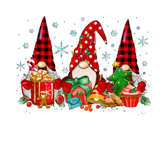 Una ilustración festiva que presenta tres gnomos alegres vestidos de rojo y negro, rodeados de golosinas y decoraciones navideñas.