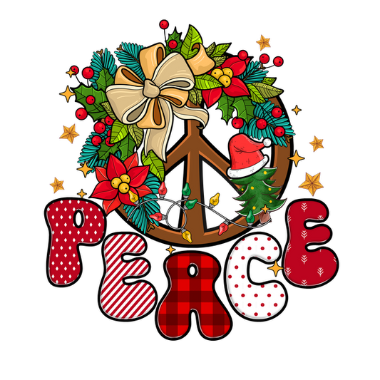 Una ilustración festiva que presenta un símbolo de paz rodeado de decoraciones navideñas, con la palabra "PAZ" en letras coloridas y divertidas.