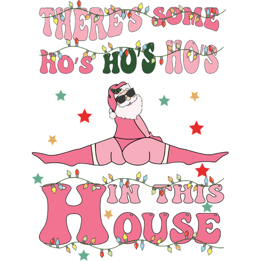 Este divertido gráfico navideño presenta una figura de Papá Noel con un traje rosa, rodeado de luces y texto festivos.