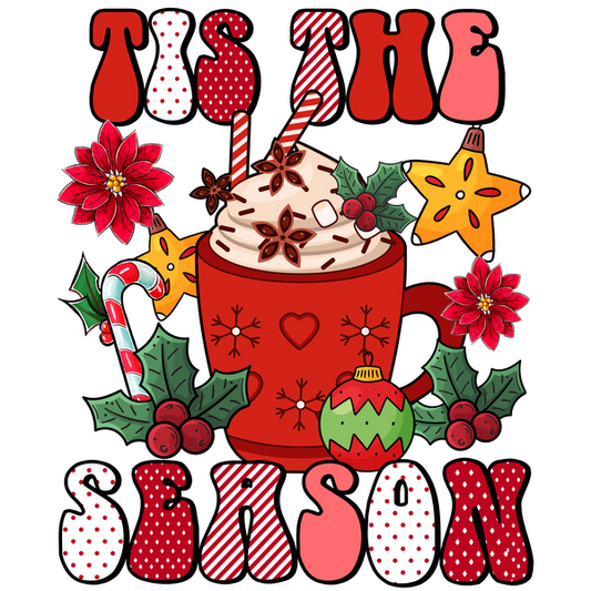 Ilustración festiva que presenta una taza roja con ingredientes de temática navideña, rodeada de decoraciones coloridas y la frase "Tis the Season".