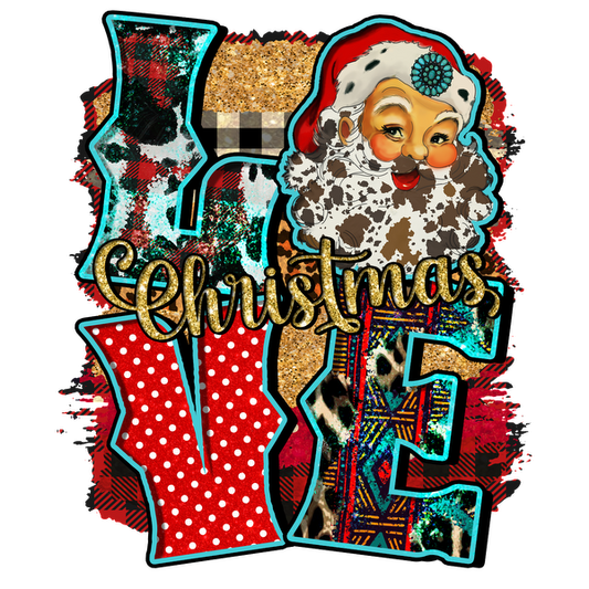 Diseño festivo que presenta un alegre Papá Noel y letras coloridas que deletrean "Love Christmas" con patrones y texturas divertidas.