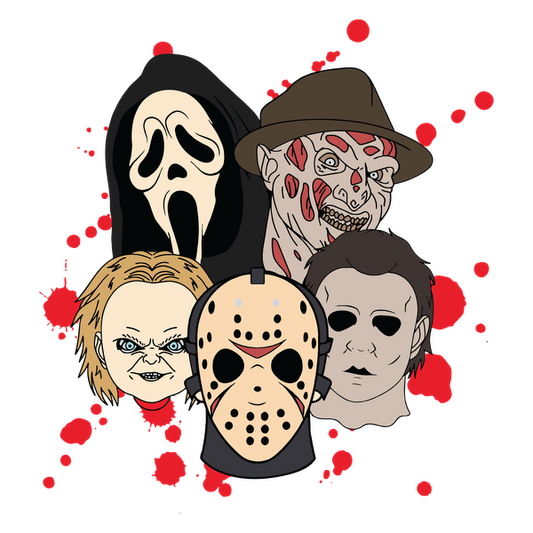 Precio habitual A partir de £0.75 GBPPrecio habitualPrecio unitario / por£2.40 GBPPrecio de oferta A partir de £0.75 GBPUna colorida ilustración que presenta máscaras icónicas de películas de terror, incluidas Jason, Michael Myers y Ghostface, sobre un fondo salpicado.