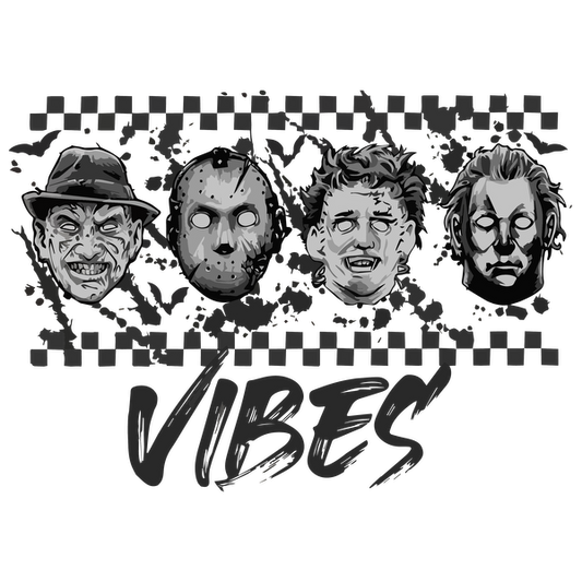 Precio habitual A partir de £0.75 GBPPrecio habitualPrecio unitario / por£2.40 GBPPrecio de oferta A partir de £0.75 GBPUn diseño artístico y espeluznante que presenta caras icónicas de películas de terror con el texto "VIBES" en un estilo vanguardista.