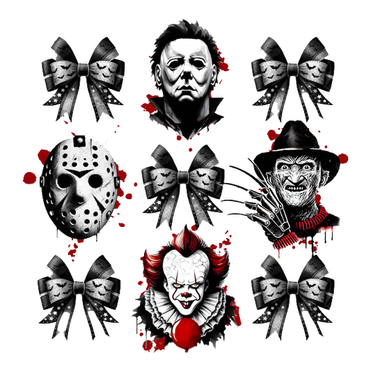 Precio habitual A partir de £0.75 GBPPrecio habitualPrecio unitario / por£2.40 GBPPrecio de oferta A partir de £0.75 GBPUn collage espeluznante con figuras de terror icónicas como Michael Myers, Jason Voorhees y Pennywise, adornado con lazos decorativos.