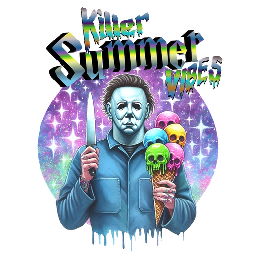 Precio habitual A partir de £0.75 GBPPrecio habitualPrecio unitario / por£2.40 GBPPrecio de oferta A partir de £0.75 GBPUn gráfico vibrante que presenta un personaje enmascarado que sostiene un cono de helado con calaveras de colores, con la leyenda "Killer Summer Vibes" (Vibraciones de verano asesinas).