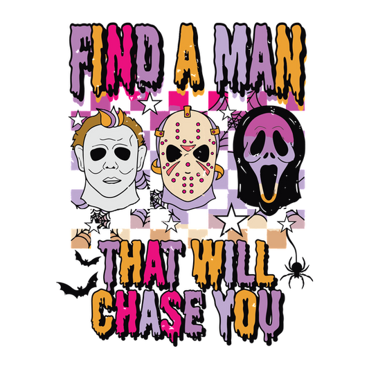 Un diseño divertido que presenta máscaras icónicas de películas de terror con el texto "Encuentra un hombre que te persiga".