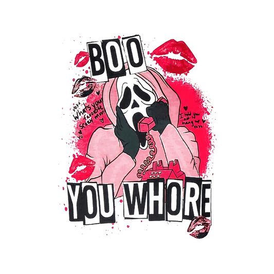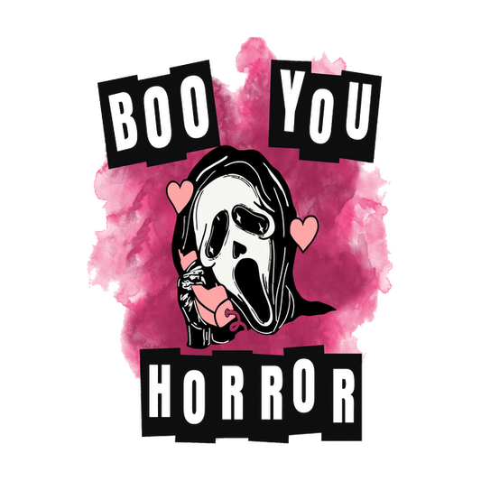 Un gráfico divertido con temática de terror que presenta una figura fantasmal que sostiene un corazón rosa, rodeado por el texto "Boo You Horror".