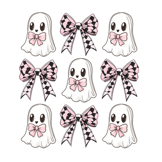 Un patrón divertido que presenta lindos fantasmas con lazos rosados y cintas a cuadros, perfecto para un diseño caprichoso.