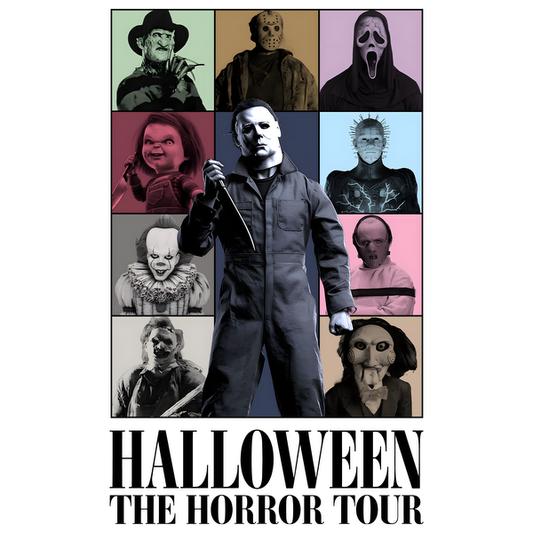 Un gráfico vibrante con temática de Halloween que presenta personajes de terror icónicos, perfecto para celebraciones de temporadas espeluznantes y noches de terror de Halloween.