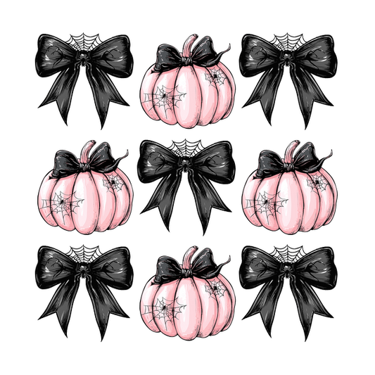 Un patrón encantador que presenta calabazas rosas con caras divertidas y lazos a juego, perfecto para una decoración con temática de Halloween.