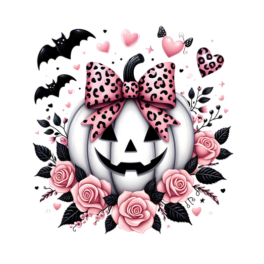 Una linda ilustración con temática de Halloween que presenta una calabaza blanca sonriente adornada con un lazo de estampado de leopardo rosa y rodeada de flores rosadas.