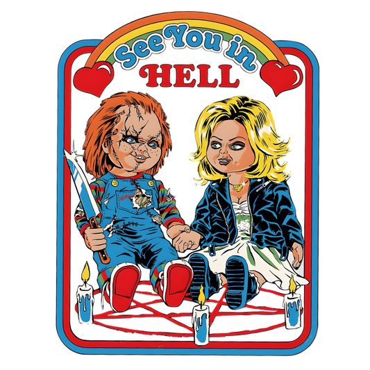 Precio habitual A partir de £0.75 GBPPrecio habitualPrecio unitario / por£2.40 GBPPrecio de oferta A partir de £0.75 GBPUna ilustración colorida de estilo de dibujos animados que presenta muñecas espeluznantes inspiradas en el terror, titulada "Nos vemos en el infierno", con detalles encantadores.