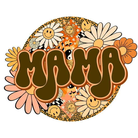 Un diseño vibrante y divertido que presenta la palabra "MAMA" rodeada de alegres flores y caras sonrientes en colores retro.