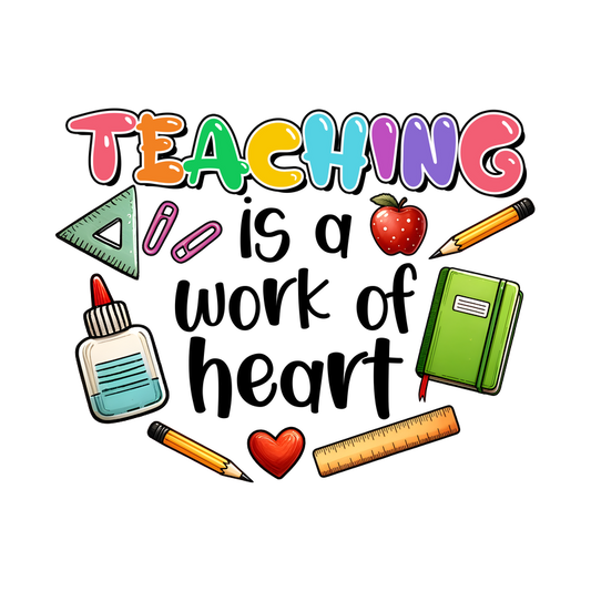 A vibrant and playful "Teaching" design featuring colorful stationery items like pencils, glue, a ruler, and an apple.DTF Transfers