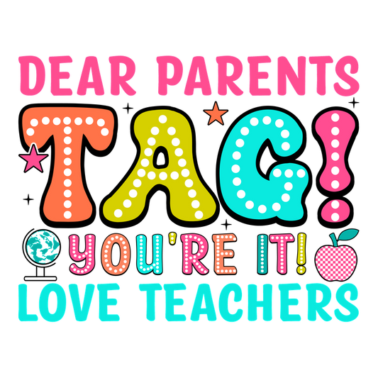A colorful and playful graphic encouraging parents to engage with teachers with the message, "Dear Parents, Tag! You're It! Love, Teachers."DTF Transfers