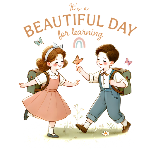 This charming illustration features two joyful children exploring nature, with the phrase "It's a beautiful day for learning" above them.DTF Transfers