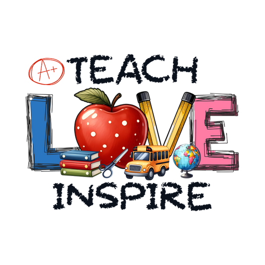 A colorful design featuring educational elements like an apple, books, a school bus, and a globe, promoting the theme "Teach, Love, Inspire."DTF Transfers