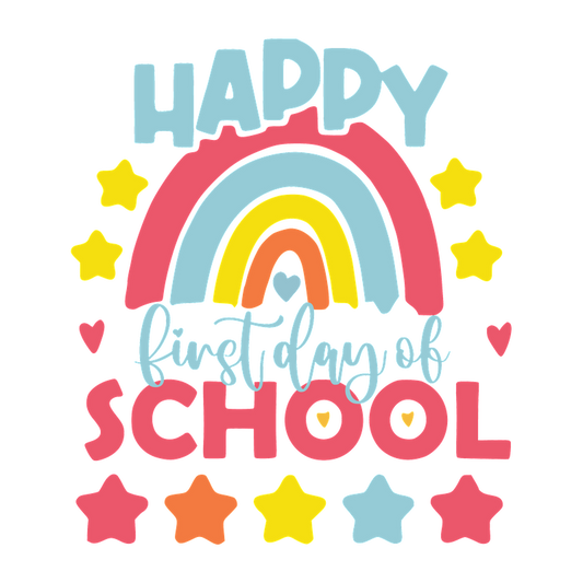 Celebrate the new beginnings with this colorful "Happy First Day of School" design featuring a rainbow and cheerful stars!DTF Transfers