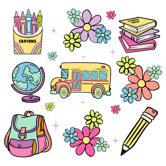 A vibrant school-themed illustration featuring crayons, a globe, books, a yellow school bus, a backpack, flowers, and a pencil.DTF Transfers