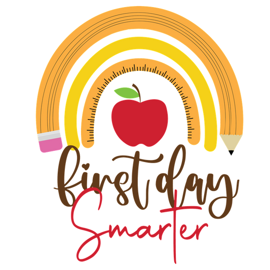 A colorful and playful design featuring pencils, an apple, and the phrase "first day smarter," perfect for back-to-school celebrations.DTF Transfers
