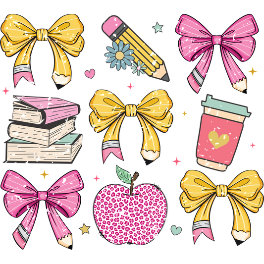 A delightful collection of colorful bows, books, and school-themed items including a leopard-print apple and a coffee cup.DTF Transfers