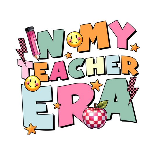 Celebrate your love for education with this vibrant "In My Teacher Era" design, featuring playful graphics and cheerful colors!DTF Transfers