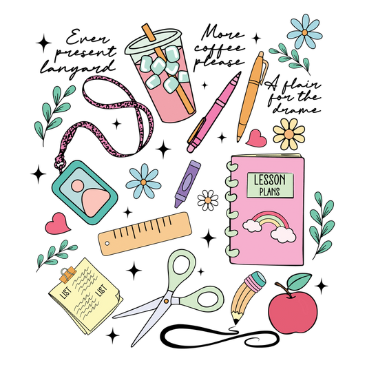 A vibrant collection of school supplies, including a pink notebook labeled "Lesson Plans," scissors, markers, and a cheerful apple.DTF Transfers