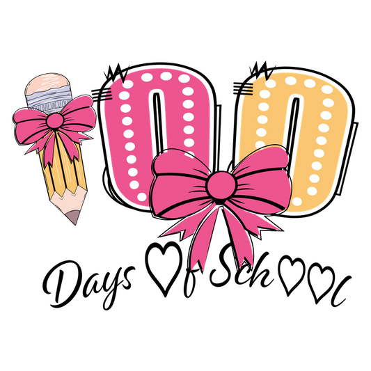 Celebrate with this playful design featuring a pencil and vibrant bows, showcasing a cheerful "100" in bright colors!DTF Transfers